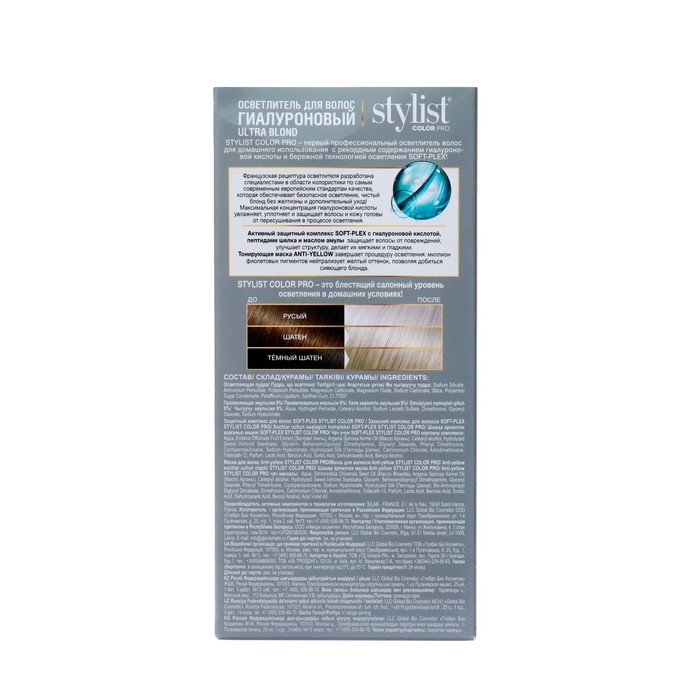 STYLIST COLOR PRO – первая профессиональный осветлитель волос для домашнего использования с рекордным содержанием гиалуроновой кислоты и бережной технологией осветления SOFT-PLEX! Французская рецептура осветлителя разработана специалистами в области колористики по самым современным европейским стандартам качества, которая обеспечивает безопасное осветление, чистый блонд без желтизны и дополнительный уход! Максимальная концентрация гиалуроновой кислоты увлажняет, уплотняет и защищает волосы и кожу головы от пересушивания в процессе осветления . Активный защитный комплекс SOFT-PLEX с гиалуроновой кислотой, пептидами шелка и маслом амулы защищает волосы от повреждений, улучшает структуру, делает их мягкими и гладкими. Тонирующая маска ANTI-YELLOW завершает процедуру осветления, миллион фиолетовых пигментов нейтрализуют желтый оттенок, позволяя добиться сияющего блонда. STYLIST COLOR PRO – это блестящий салонный уровень осветления в домашних условиях!