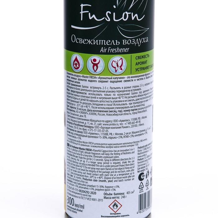 Легкий нежный аромат освежителя воздуха ''Master Fresh Fusion'' надолго сохранит ощущение свежести и чистоты в Вашем доме. Специально разработанная формула ''Bio fresh formula'' обеспечивает три-активное действие продукта: свежесть, аромат и нейтрализатор неприятных запахов. Оригинальные парфюмерные отдушки - аромат кофе в вашем доме.