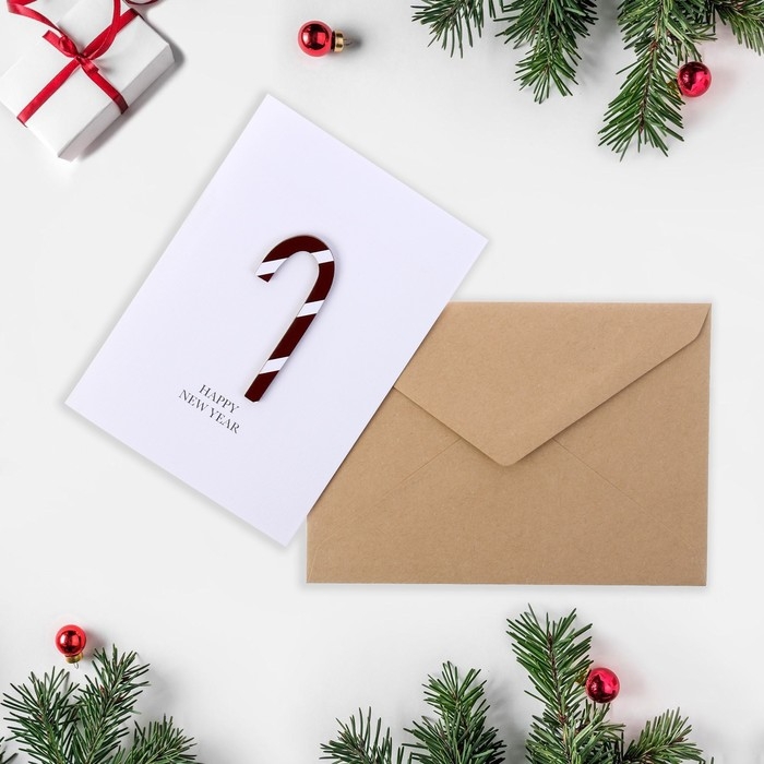 Открытка с деревянным элементом "Happy New Year!" ручная работа, трость, 14,7х10,5 см