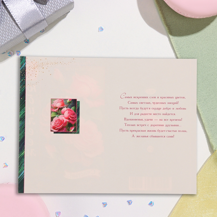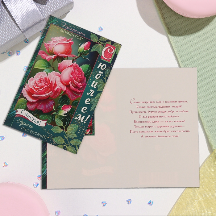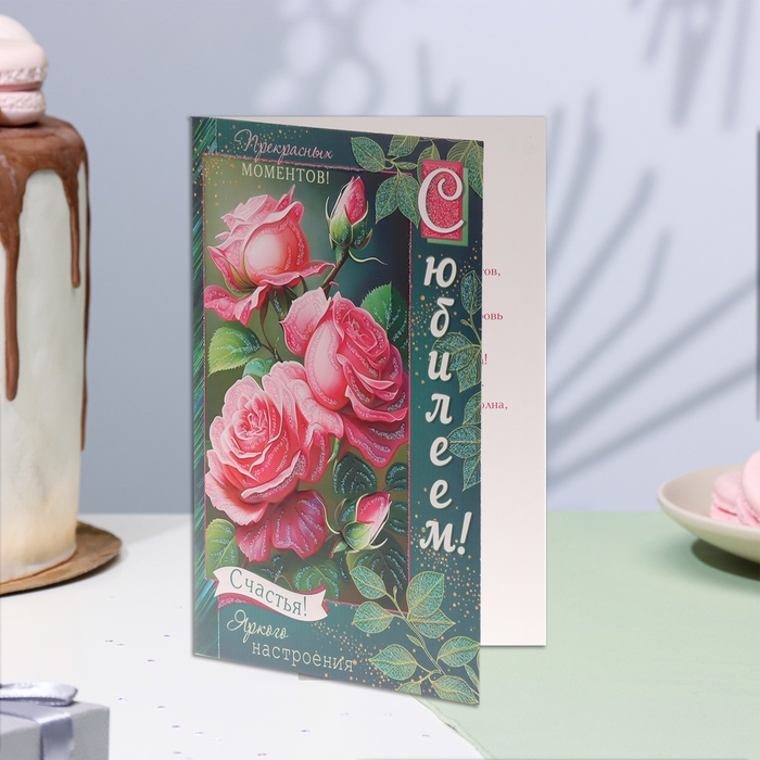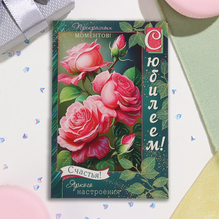 Открытка "С Юбилеем!" глиттер, конгрев, розовые розы, зелёная рамка, 12,5х19,4 см