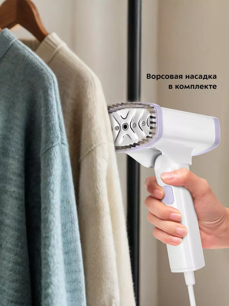 В отпаривателе КТ-9237 управление процессом подачи пара осуществляется с помощью одной кнопки на ручке прибора. В комплекте предусмотрена ворсовая насадка, которая поможет очистить вещи от ниток и шерсти домашних животных. Для удобства заполнения резервуара для воды в комплекте есть мерный стакан.