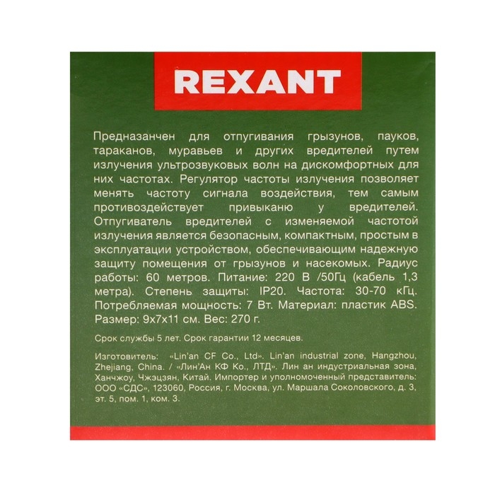 Отпугиватель вредителей Rexant 71-0009, универсальный, ультразвуковой, r=60 м, 220 В