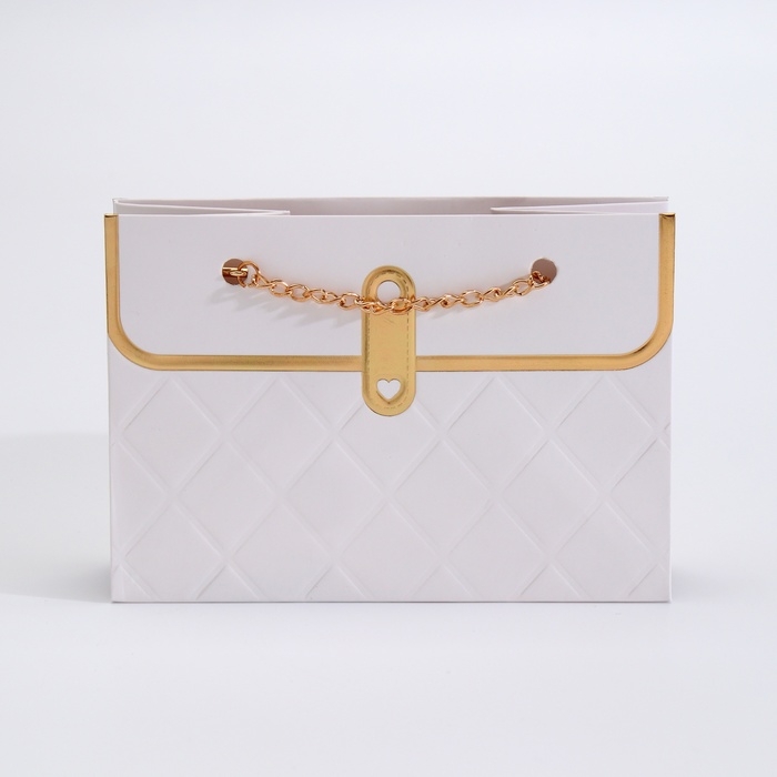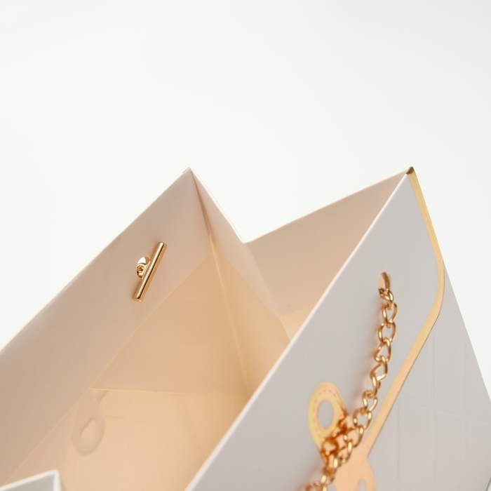 Главное украшение пакета — изящная цепочка, выполняющая функцию ручки. Она не только придаёт изделию элегантный вид, но и обеспечивает удобство при переноске. Золотое тиснение на поверхности добавляет пакету особого шика, создавая утончённый и праздничный акцент. Оно подчёркивает внимание к деталям и делает упаковку визуально привлекательной.