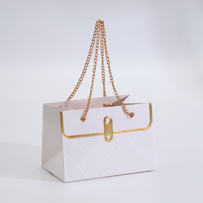 Пакет для цветов, ручка цепь, "Белый", с золотым тиснением, 15 х 10,5 х 10 см