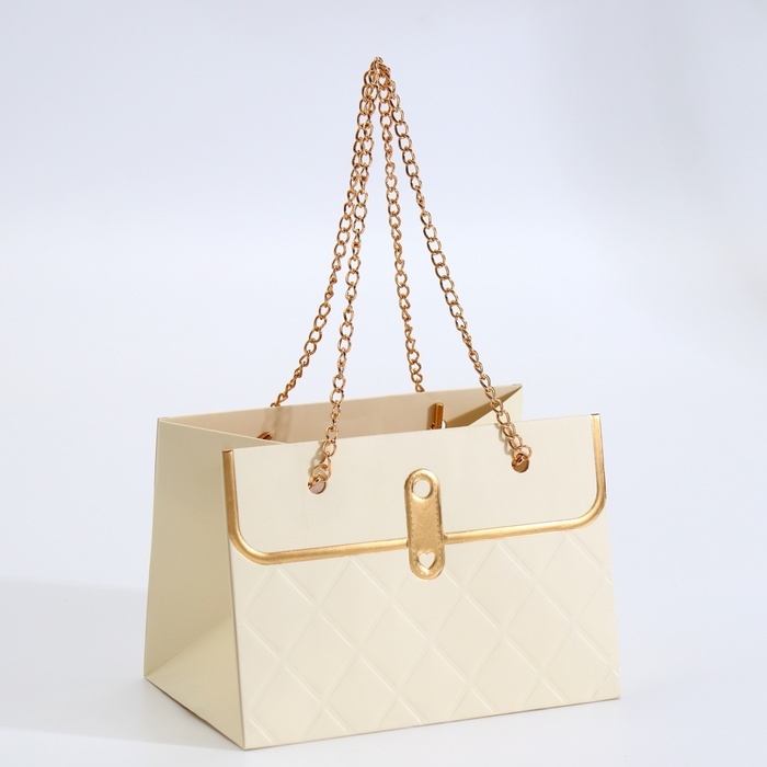 Пакет для цветов, ручка цепь, "Кремовый", с золотым тиснением, 15 х 10,5 х 10 см