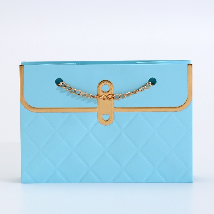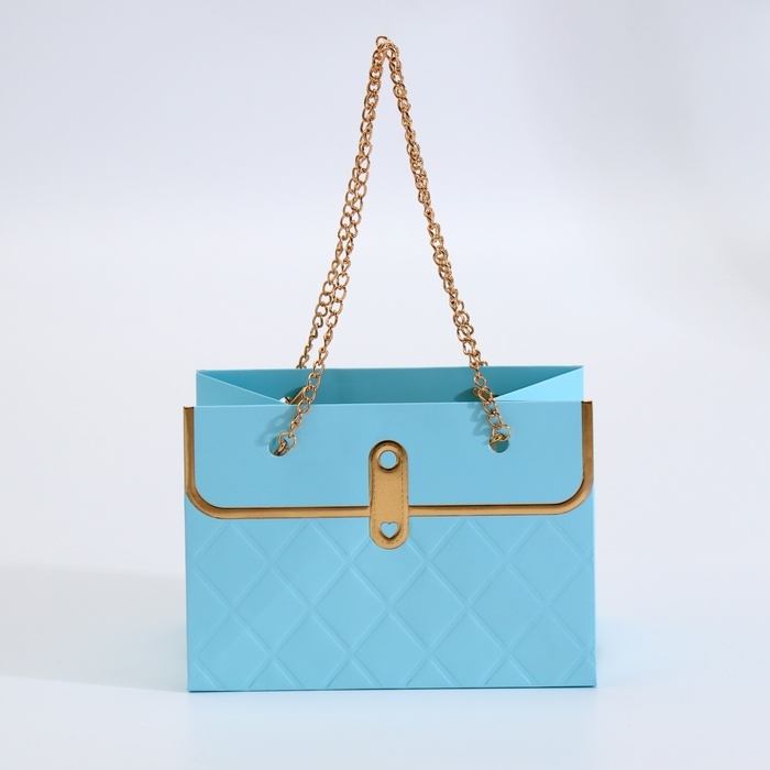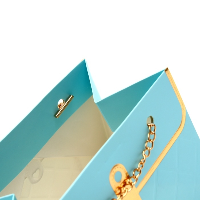 Главное украшение пакета — изящная цепочка, выполняющая функцию ручки. Она не только придаёт изделию элегантный вид, но и обеспечивает удобство при переноске. Золотое тиснение на поверхности добавляет пакету особого шика, создавая утончённый и праздничный акцент. Оно подчёркивает внимание к деталям и делает упаковку визуально привлекательной.