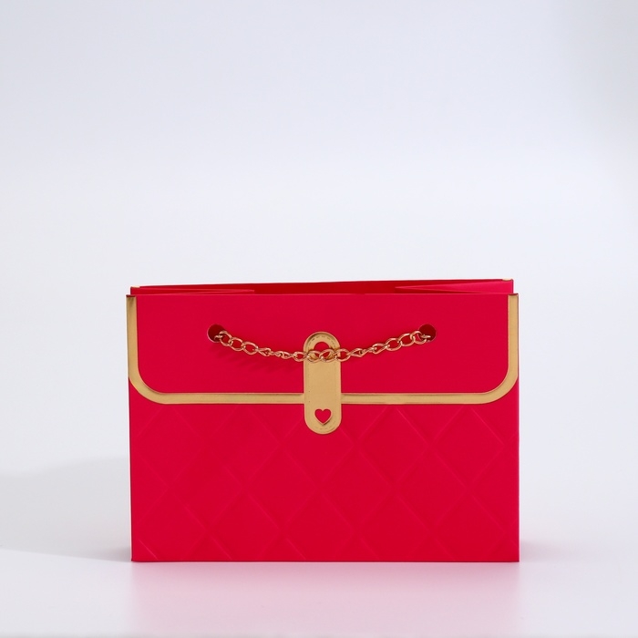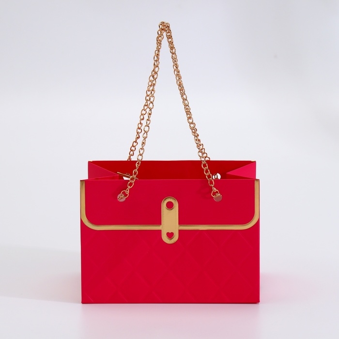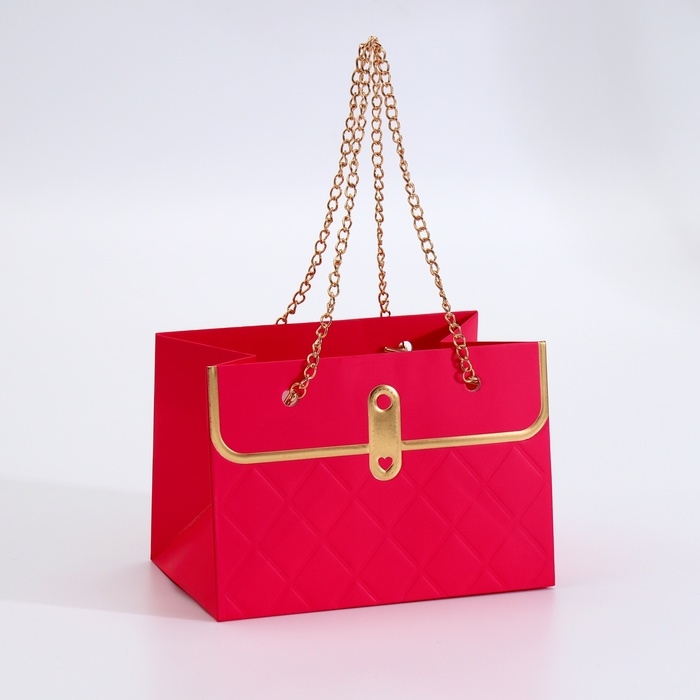 Главное украшение пакета — изящная цепочка, выполняющая функцию ручки. Она не только придаёт изделию элегантный вид, но и обеспечивает удобство при переноске. Золотое тиснение на поверхности добавляет пакету особого шика, создавая утончённый и праздничный акцент. Оно подчёркивает внимание к деталям и делает упаковку визуально привлекательной.