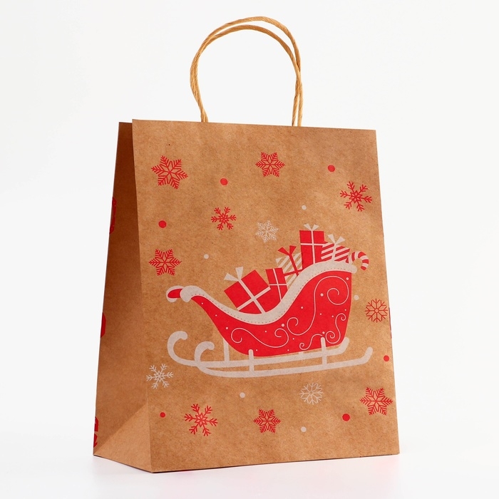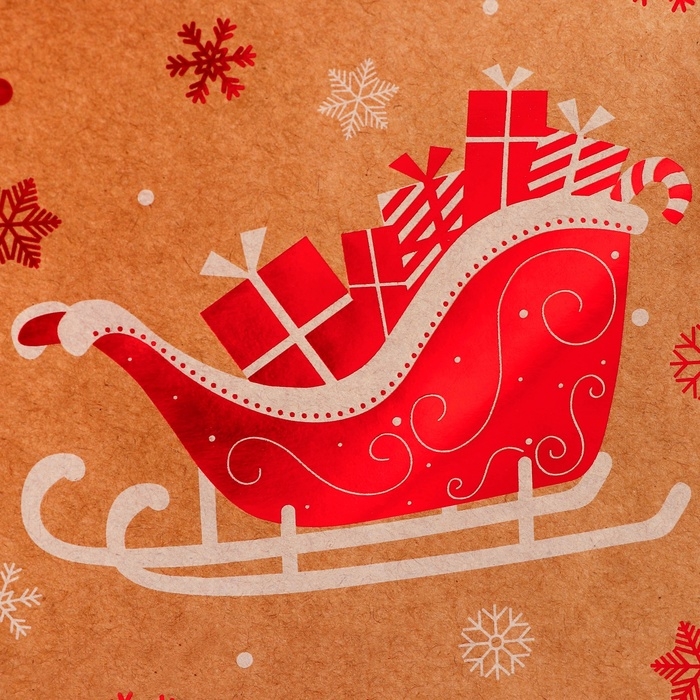 Пакет крафт с тиснением, круглая ручка, "Новогдние сани" 33 х 25 х 12 см, 120 г