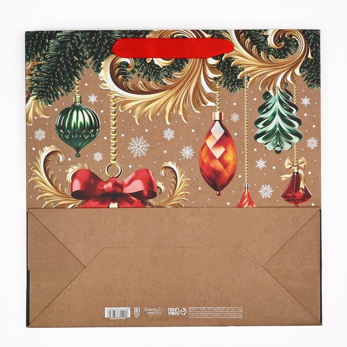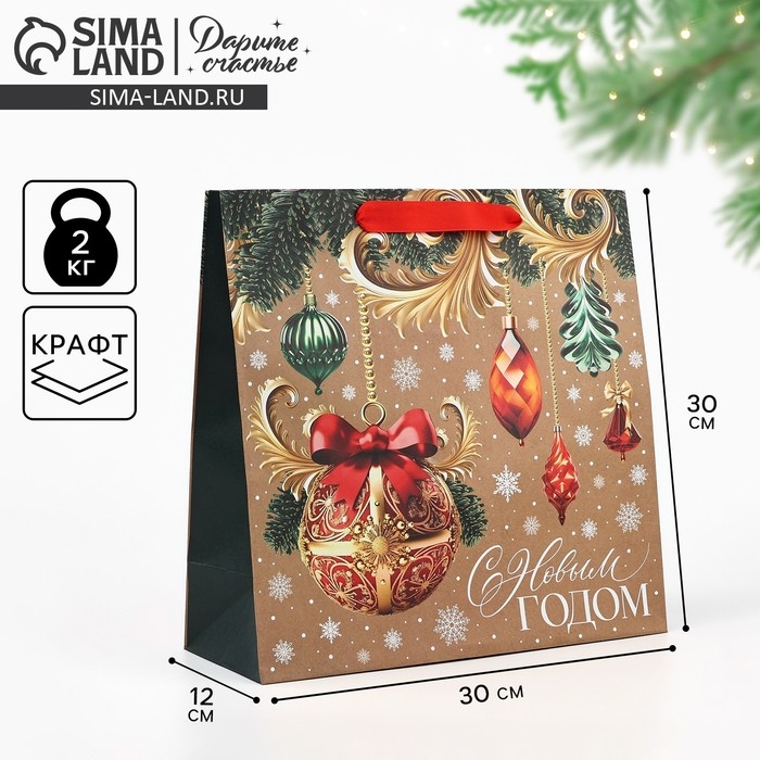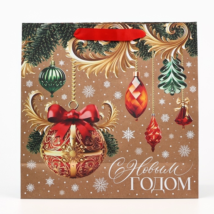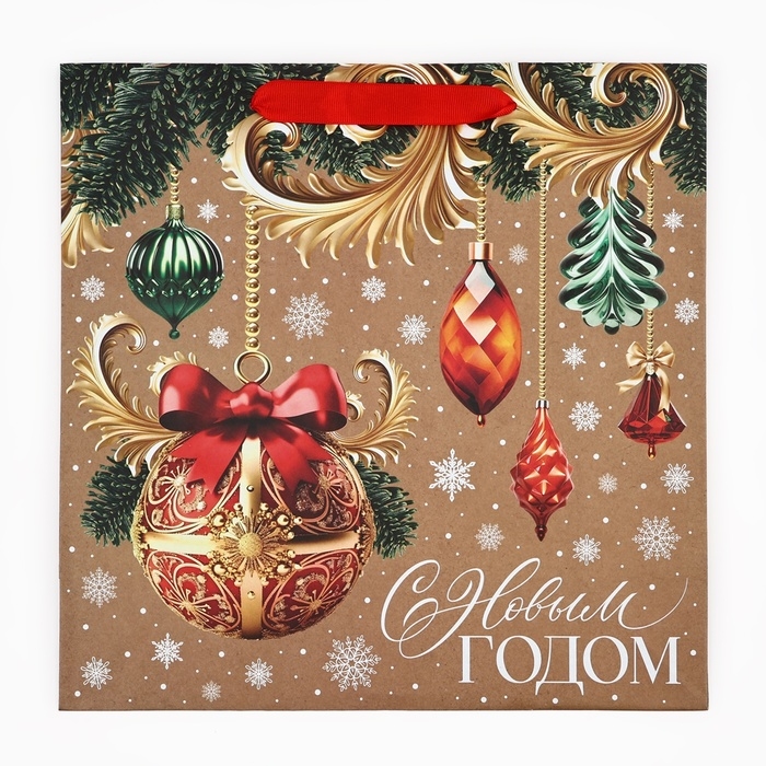 Пакет подарочный новогодний крафтовый квадратный «Новогодние игрушки», 30 х 30 х 12 см, Новый год