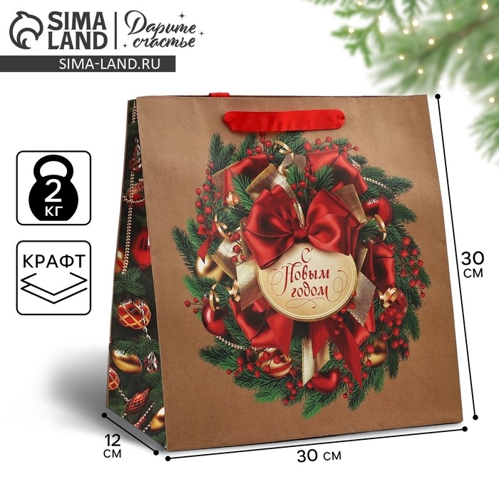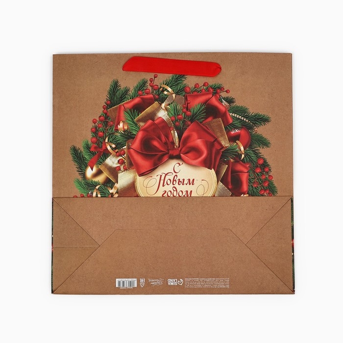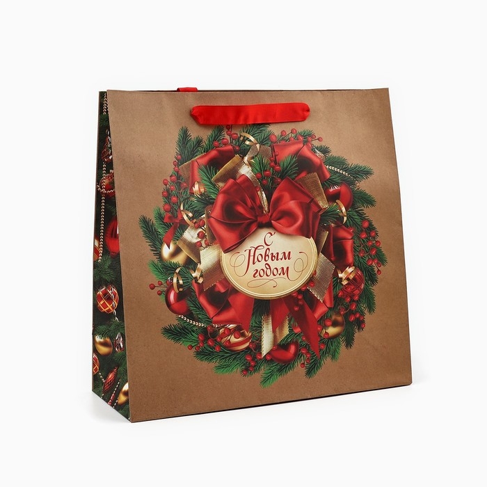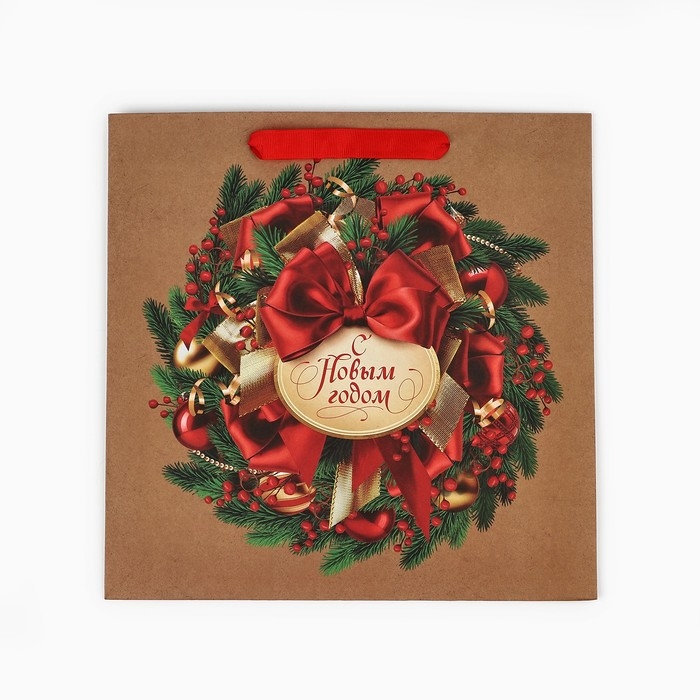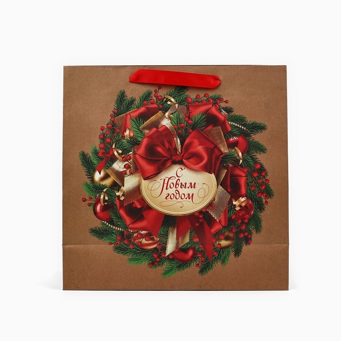 Пакет подарочный новогодний крафтовый квадратный «Новогодний венок», 30 х 30 х 12 см , Новый год