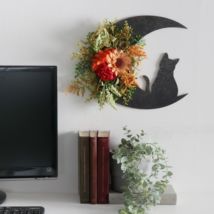 Панно дерево "Кошка на месяце, букет с подсолнухом" 30х30 см