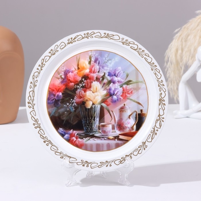 Панно-тарелка «Ирисы», белая, D = 20 см, лаковая миниатюра