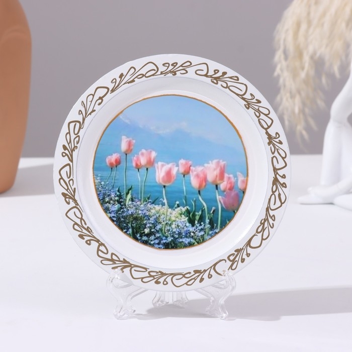 Панно-тарелка «Тюльпаны», белая, D = 14,8 см, лаковая миниатюра