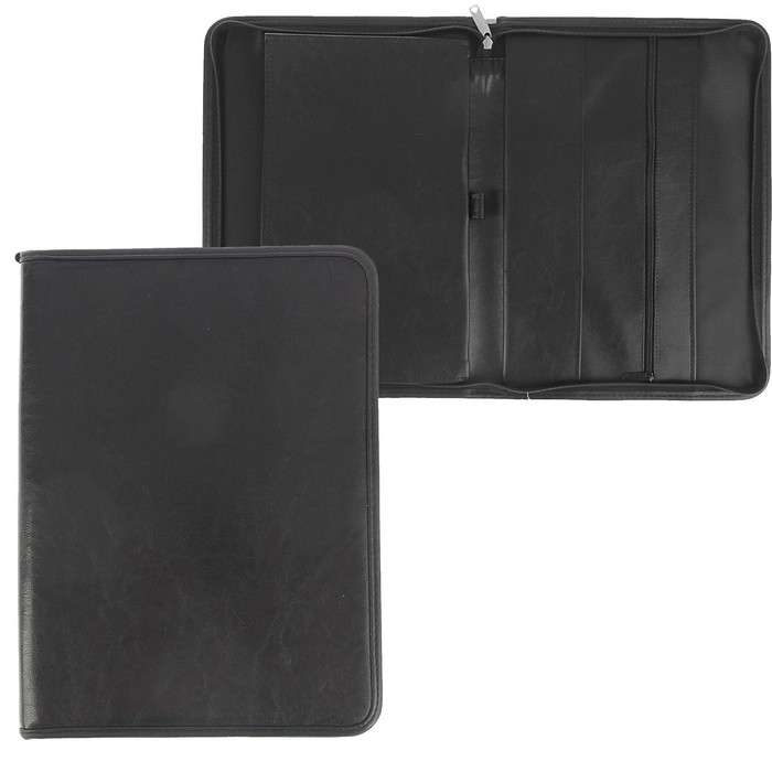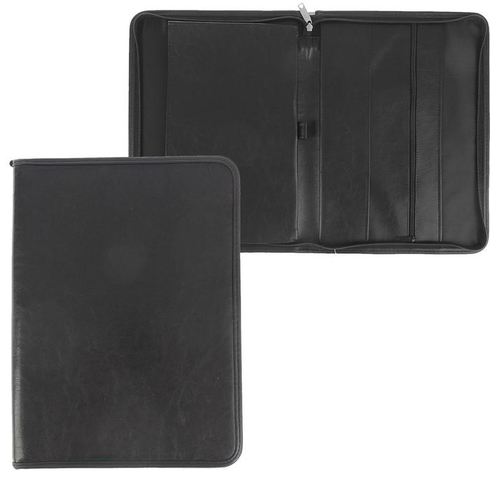 Представительная деловая папка на молнии.Изготовлена из черного К/З Люкс.Размер изделия 275 на 370 мм. Толщина папки 30 мм.Внутри расположено удобных, вместительных 2 кармана плюс карман на молнии и 3 кармашка под визитки.