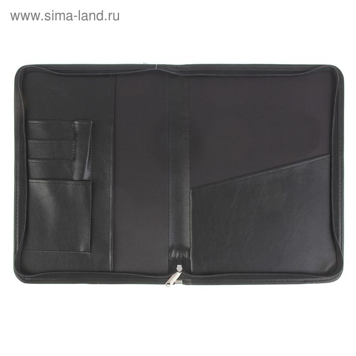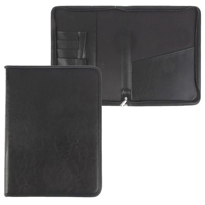 Представительная деловая папка на молнии.Изготовлена из черного К/З Люкс.Размер изделия 250 на 350 мм. Толщина папки 30 мм.Внутри расположено удобных, вместительных 2 кармана плюс 2 кармашка под визитки и ручки.