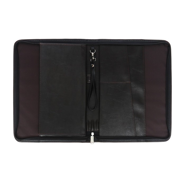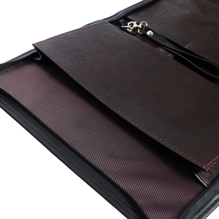 Представительная деловая папка на молнии.Изготовлена из черного К/З Люкс.Размер изделия 250 на 350 мм. Толщина папки 30 мм.Внутри расположено удобных, вместительных 4 кармана.Удобная ручка в виде петли.