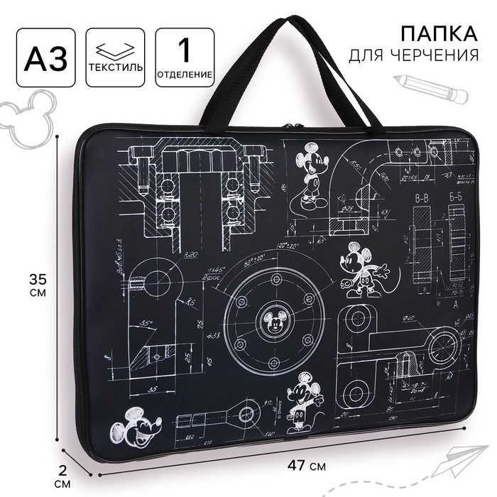 Папка для черчения и рисунков А3, 470х350х20 мм с ручками, текстильная,Микки Маус