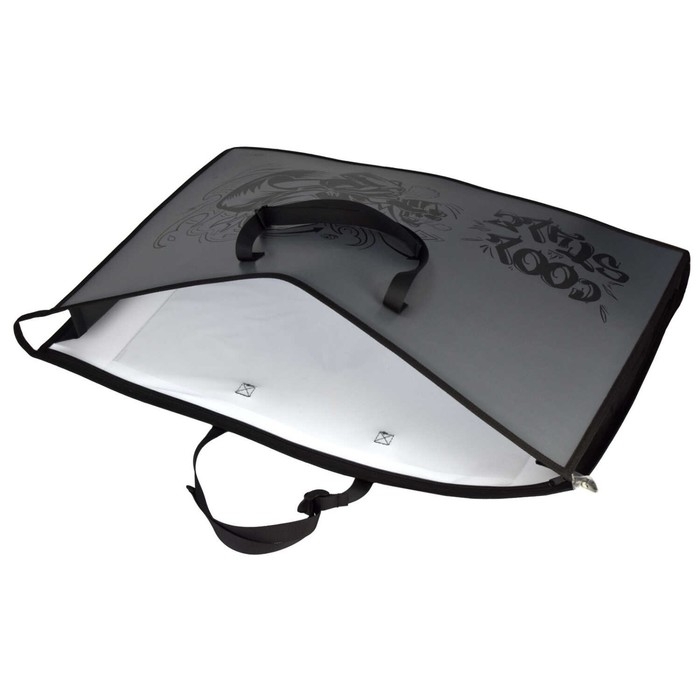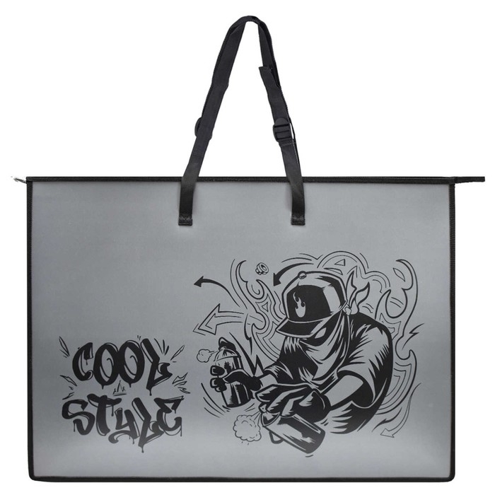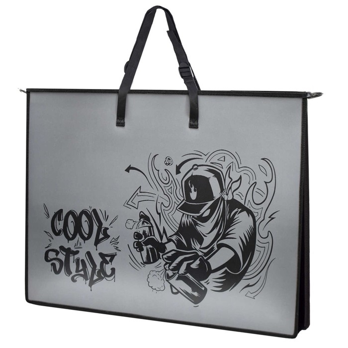 Папка для чертежей и рисунков. РАЙТЕР. Формат А2. Размер: 65х47х11 см. Материал: полипропилен. Толщина: 500 мкм. Количество отделений - 1 отделение (-я). Тип застёжки: молния. Отделка: УФ-печать. Цвет: чёрный. Особенности: ручки, регулируемые по длине, внутренний ПВХ карман А4 формата, ширина боковин и дна 11см. Индивидуальная упаковка: ПЭТ-пакет.