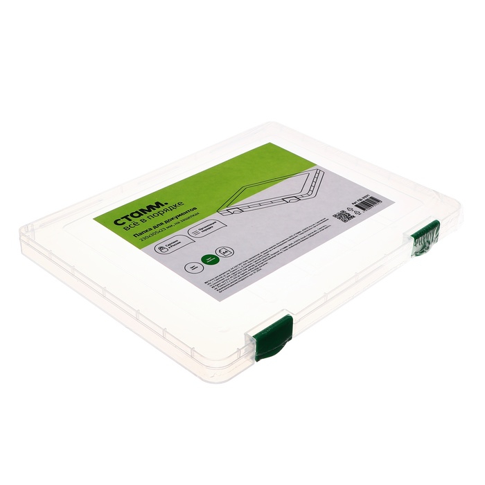 Папка для документов А4, с зелеными защелками, 230 х 305 х 23 мм, прозрачный корпус