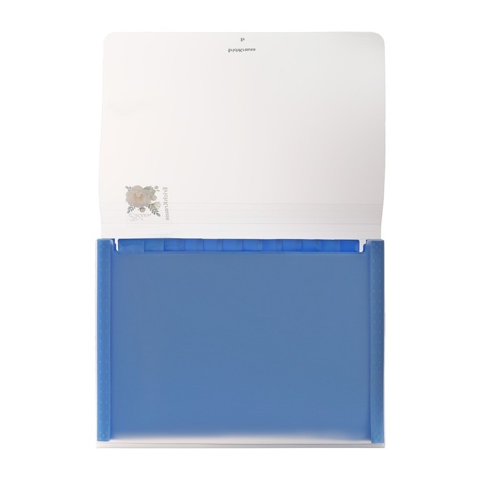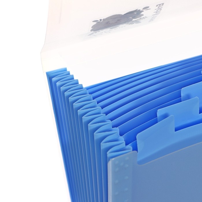 Папка-картотека с 13 отделениями формата А4 из высококачественного пластика с текстурой поверхности "песок", на которой не видно отпечатков пальцев и мелких царапин. Предназначена для хранения, систематизации и транспортировки документов. Цвет папки - прозрачный, цвет отделений - ассорти: голубой, зеленый, персиковый, фиолетовый. Эластичные резинки надежно удерживают папку в закрытом состоянии. Размер - 330х240х28мм, толщина - 0.55мм. Код и баркод на каждой единице товара