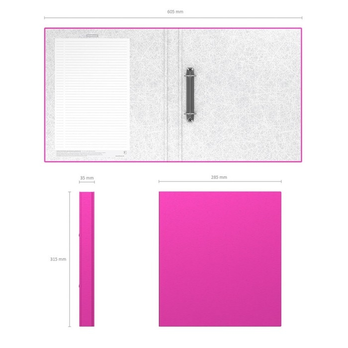 Папка - регистратор формата А4 снабжена механизмом на O-кольцах диаметром 25 мм. Изготовлена из картона толщиной 1,75 мм, покрытого бумагой со структурным тиснением и водоотталкивающей поверхностью. Корешок шириной 35 мм. Вместительность до 250 листов бумаги плотности 80 г/м². На форзаце есть шаблон для оглавления. Удобна для проведения презентаций, представления документации на семинарах. Коллекция представлена в ярких неоновых цветах.