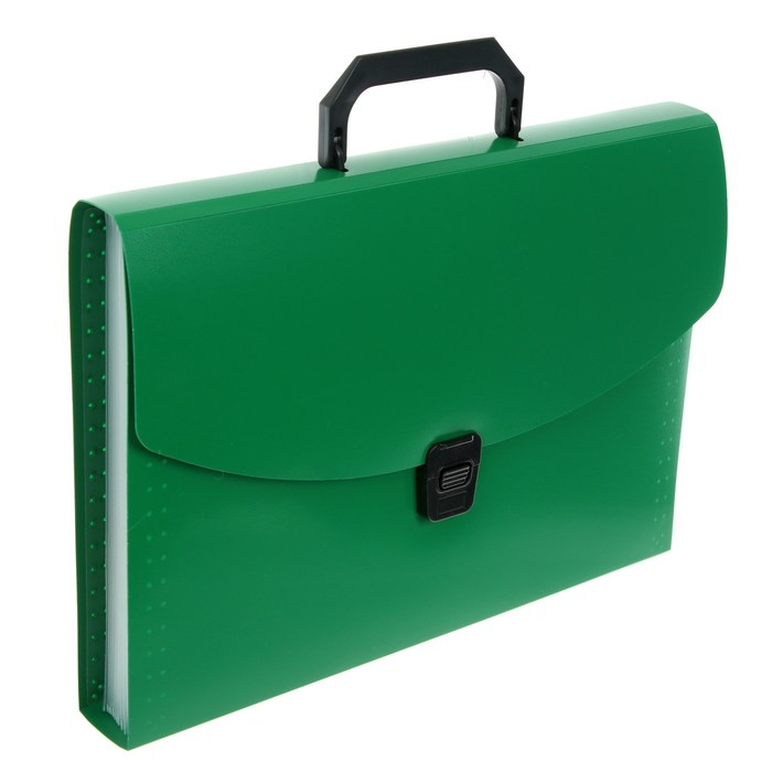 Вместительная папка-портфель предназначена для безопасной транспортировки документов. Она позволит упорядочить бумаги и сохранить их в целости. Формат: А4. Количество отделений: 13. Толщина: 700 мкм. Вмещает до 300 листов. Цвет: зелёный.