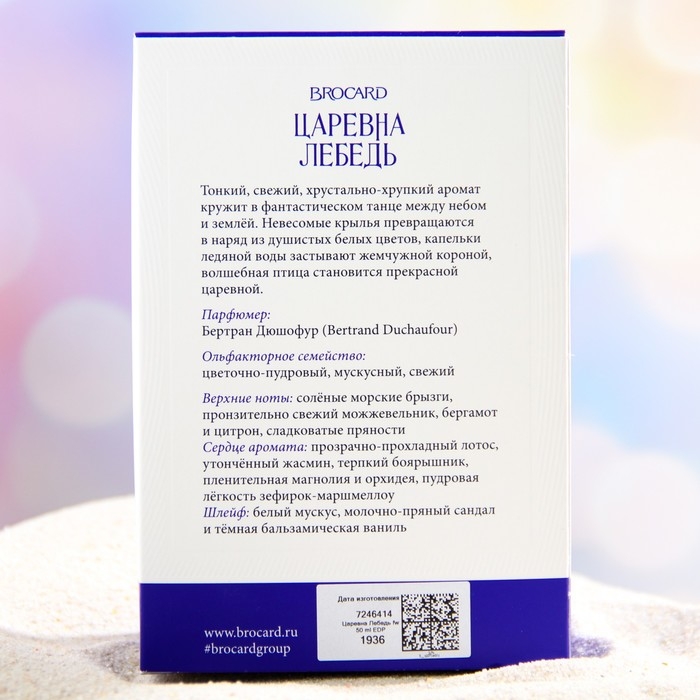 Царевна Лебедь - аромат-прикосновение, волшебное одеяние, сотканное из тающей морской пены, из нежнейшего пуха, из пудрово-сладкого зефира и цветочных лепестков. В водной прохладе разливается чувственное тепло боярышника. Запах его ягод бодряще-терпкий, запах цветов - пряно-медовый, пленительный, как свободный танец. Аромат навевает волшебные грёзы и обещает чудесные превращения.