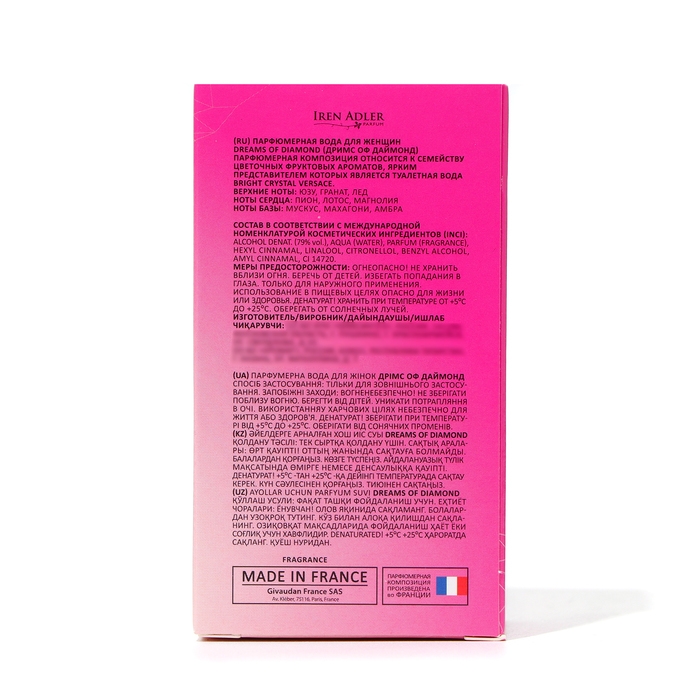Парфюмерная вода "Dreams of Diamond" – это утонченный аромат, созданный по мотивам яркого и чувственного аромата "Bright Crystal" от Versace. Этот ароматный бриллиант вмещает в себя изысканное сочетание нот, придающих ему неповторимую гармонию.