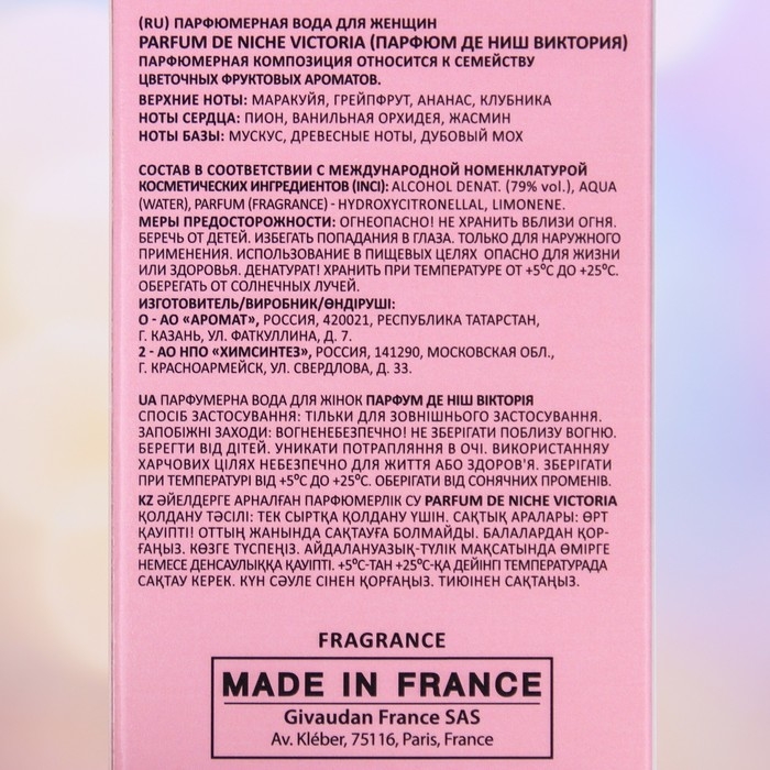 Парфюмерная композиция относится к семейству фруктовых цветочных ароматов.