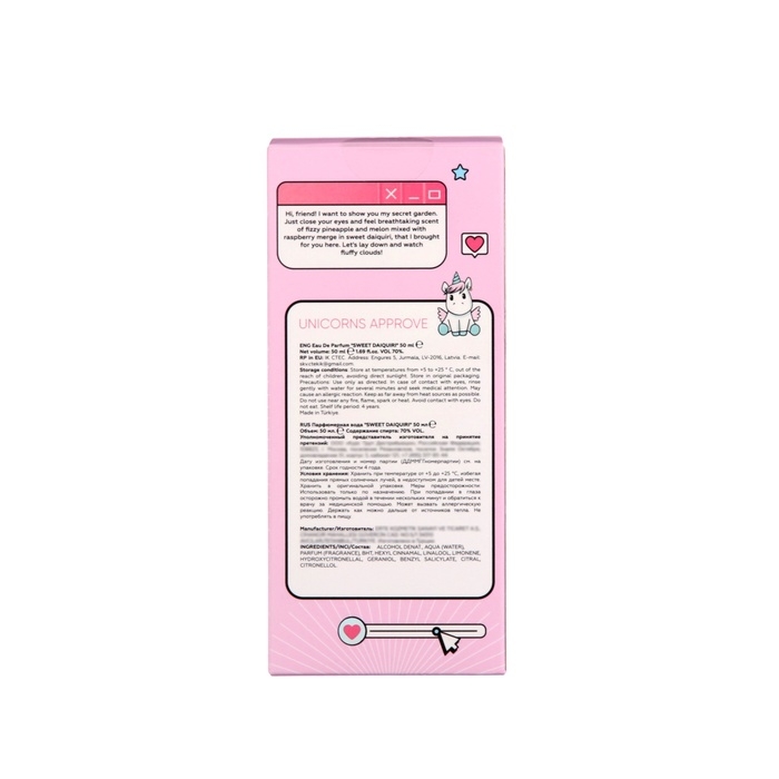 Парфюмированная вода женская Unicorns Approve "Sweet Daiquiri", 50 мл — это аромат, который окунет вас в атмосферу волшебства и беззаботности. Этот парфюм словно создан для тех, кто любит мечтать и наслаждаться каждым моментом жизни.