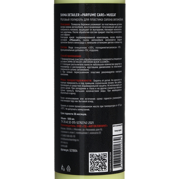 Парфюмированный полироль для пластика SHIMA, матовый, Мускат, 500 мл