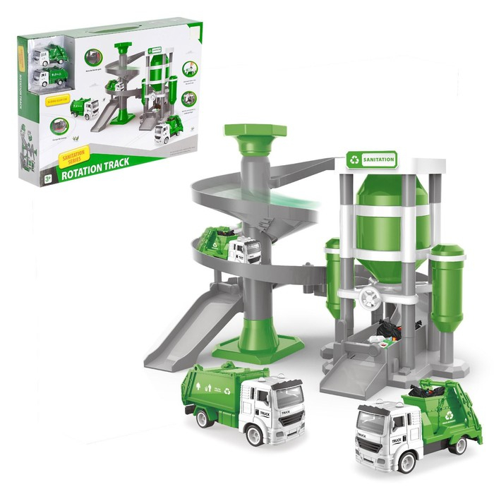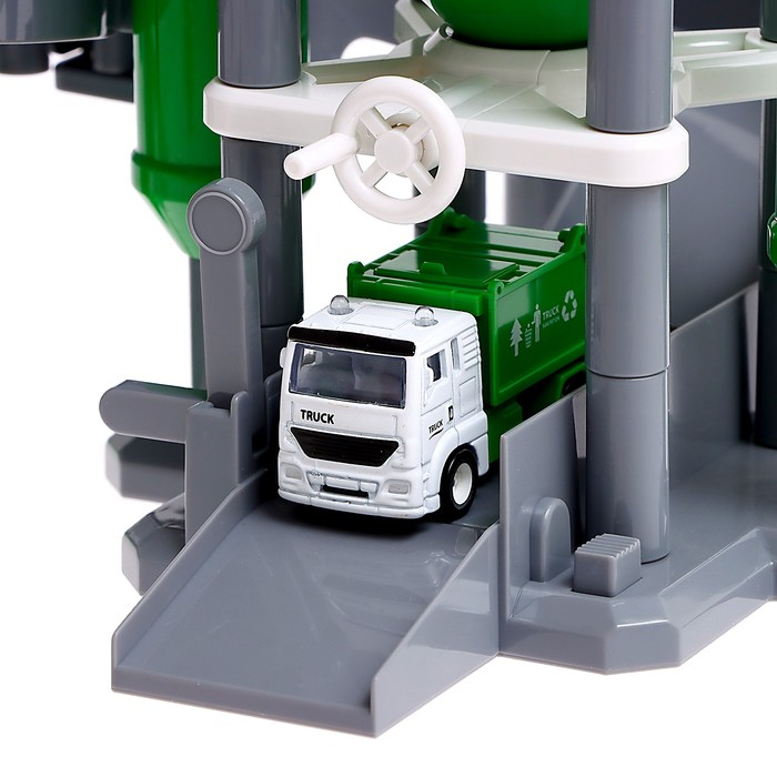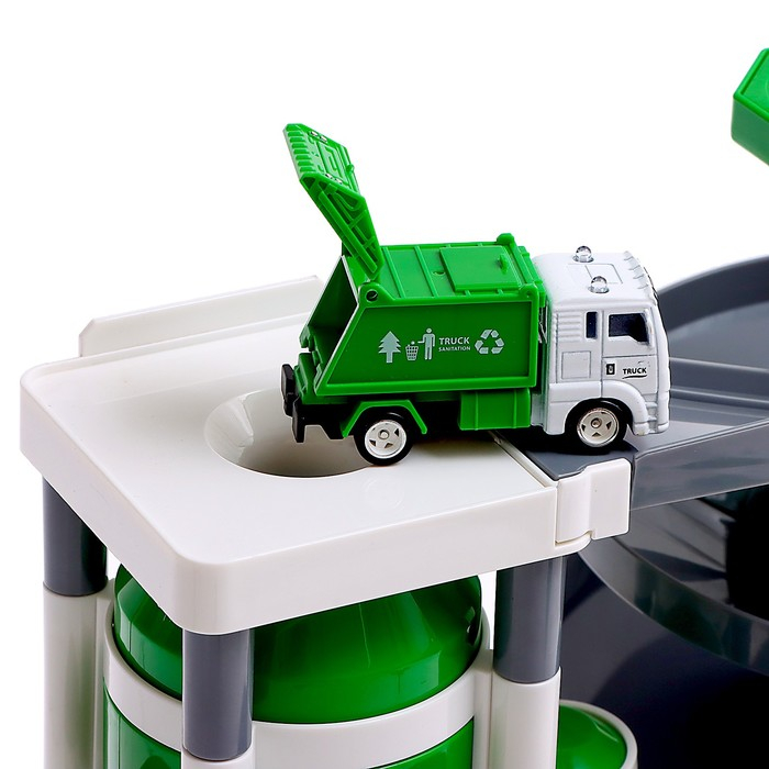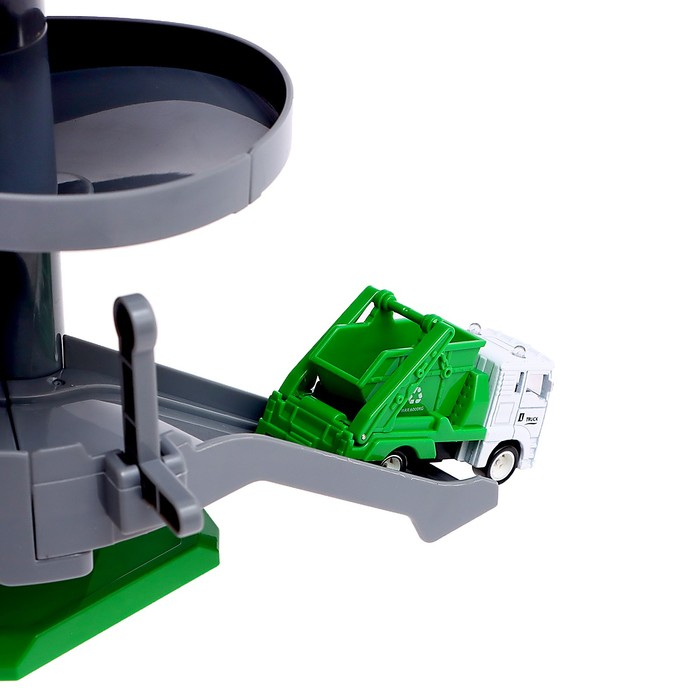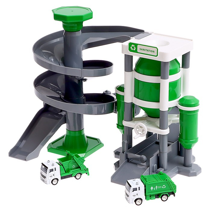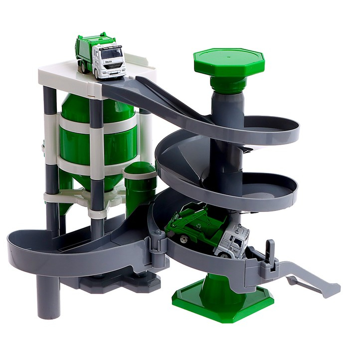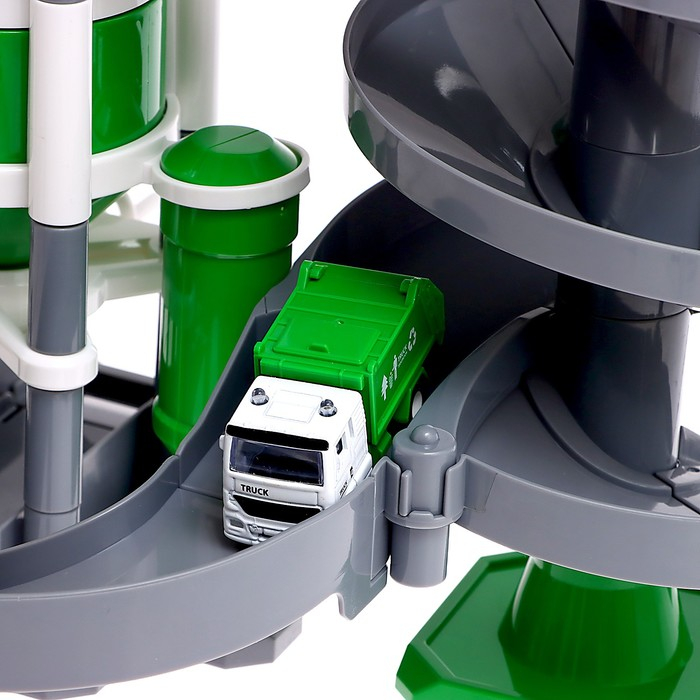 Парковка «Городские службы» вместит все любимые машинки мальчишки. Транспортный комплекс оборудован платформой мусорного трапа, в комплекте есть 2 спецтехники. Для быстрого выезда предусмотрено сразу два покатых спуска.