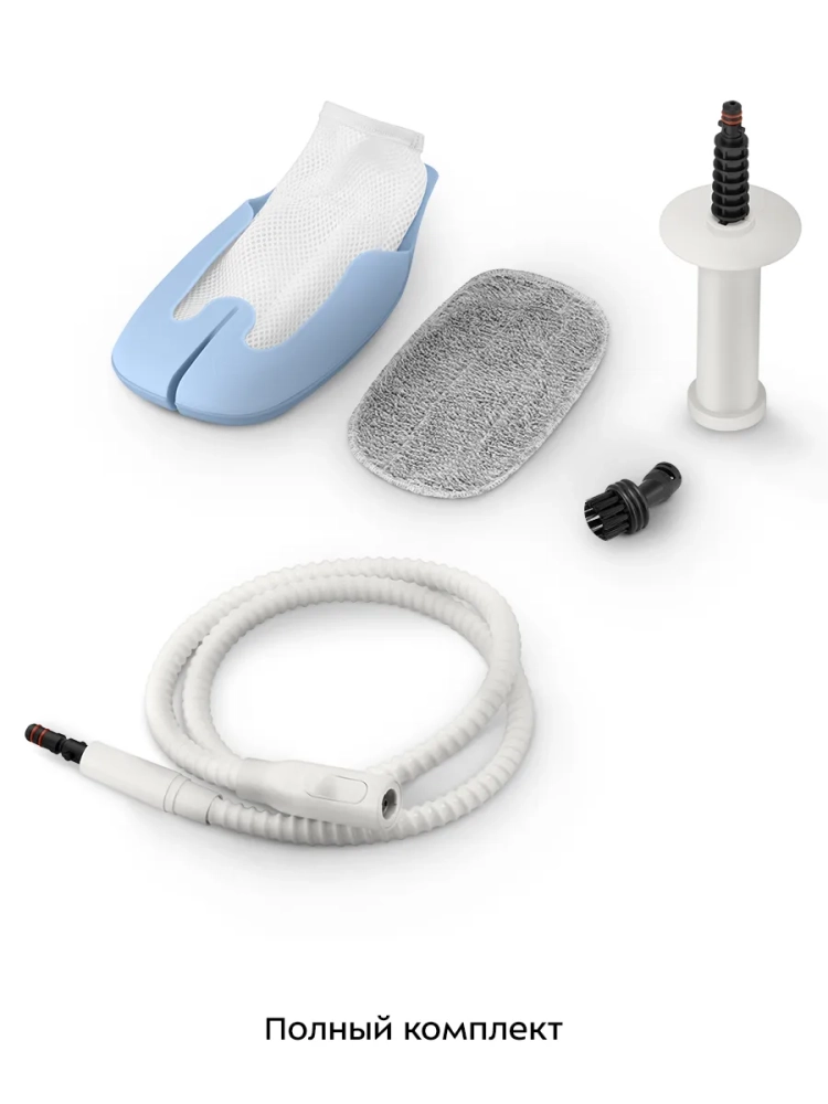 Насадки в комплекте помогут очистить труднодоступные или сильнозагрязненные поверхности. Струйная насадка поможет очистить щели и углы. Нейлоновая щетка эффективно очищает сложные загрязнения с помощью механического воздействия. Варежка для отпаривания может использоваться для отпаривания одежды и чистки обивки мягкой мебели, а также для удаления пыли с самых разных поверхностей, в том числе решетчатых, если на нее установить тряпку. С помощью мерного стакана из комплекта удобно заполнять резервуар для воды.