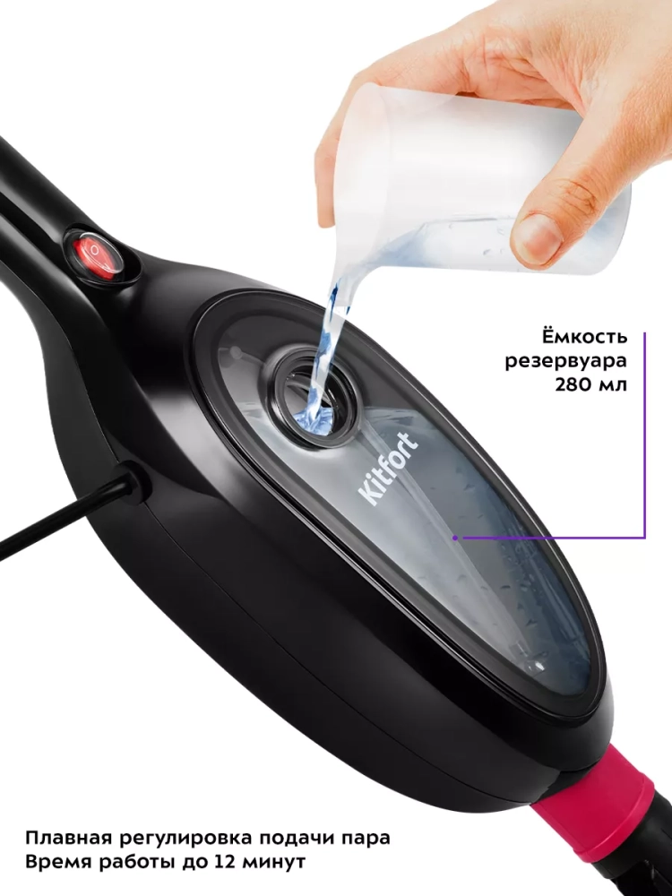 Устройство оснащено съемным резервуаром для воды емкостью 280 мл, что позволяет производить непрерывную уборку до 12 минут.