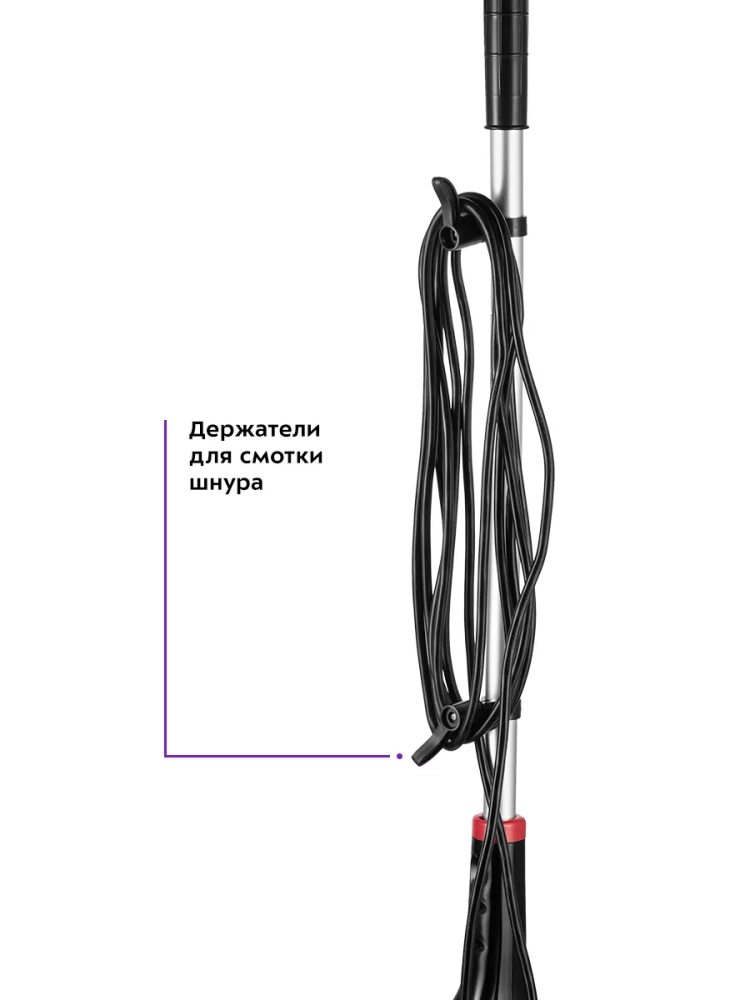 Паровая швабра обладает функцией вертикальной парковки и большим углом наклона при уборке, который поможет убрать пространство под мебелью. В устройстве предусмотрены держатели для шнура. Удлинительная трубка съемная, что обеспечивает компактное хранение.