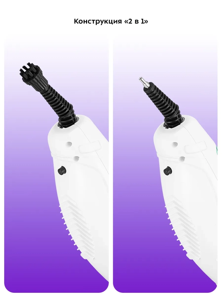 Конструкция «2 в 1» предусматривает использование ручного модуля паровой швабры с насадками без присоединения к нему удлинительной ручки. Большое количество насадок в комплекте поможет очистить труднодоступные или сильнозагрязненные поверхности. Струйная насадка используется для очистки щелей и углов. Латунная и нейлоновая щетки эффективно очищают сложные загрязнения с помощью механического воздействия. Для очистки окон, зеркал и кафельной плитки предусмотрена насадка со скребком. С помощью мерного стакана из комплекта удобно заполнять резервуар для воды. Спица для чистки предназначена для удаления загрязнений в паровом шланге, насадках и паровом сопле ручного модуля.