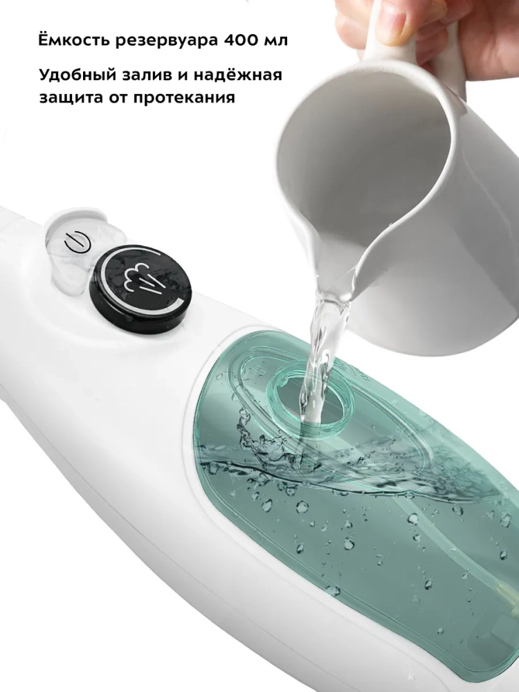 Устройство оснащено съемным резервуаром для воды емкостью 400 мл, что позволяет производить непрерывную уборку до 10–15 минут в зависимости от интенсивности выходящего пара.