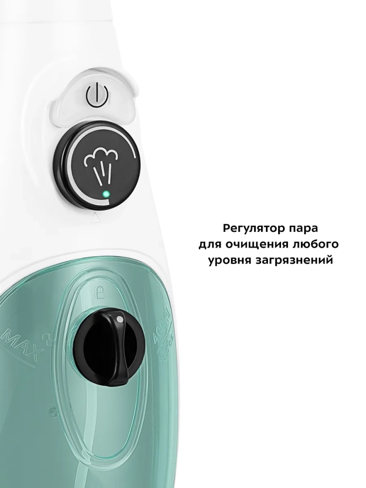 Регулятор подачи пара позволяет плавно настраивать интенсивность выходящего пара. Это очень удобно при очистке разных типов поверхностей с разным уровнем загрязнения. Чем сильнее загрязнение, тем больше пара потребуется.