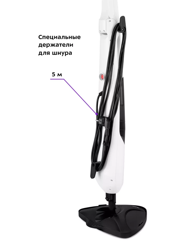 Паровая швабра обладает функцией вертикальной парковки и большим углом наклона при уборке, который поможет легко убирать пространство под мебелью. Напольная щетка закреплена на специальном шаровом шарнире с наклоном в двух плоскостях, что делает швабру очень маневренной и облегчает процесс уборки.