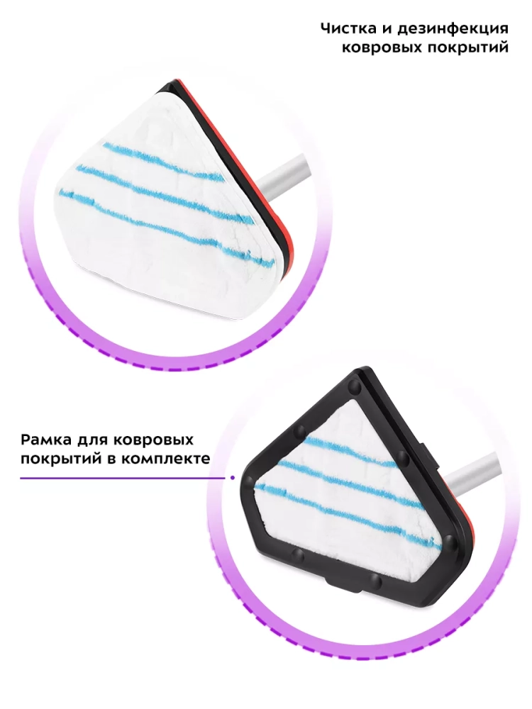 Принцип действия паровой швабры основан на воздействии горячего пара на загрязнения. Пар проникает внутрь загрязнения, размягчая и растворяя его, а затем с помощью тряпки частички грязи смываются. Для паровой швабры не нужны чистящие средства, поэтому она станет идеальным решением для уборки дома для аллергиков. В комплекте есть рамка для ковра, которая обеспечивает легкое скольжение щетки для пола по ковру.