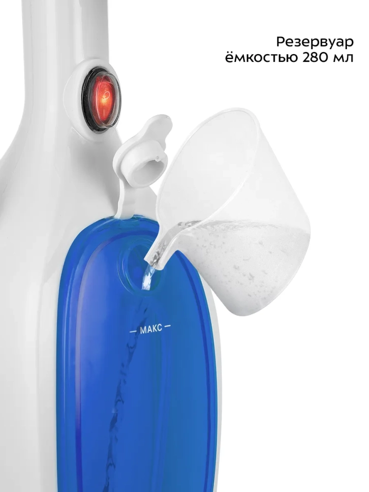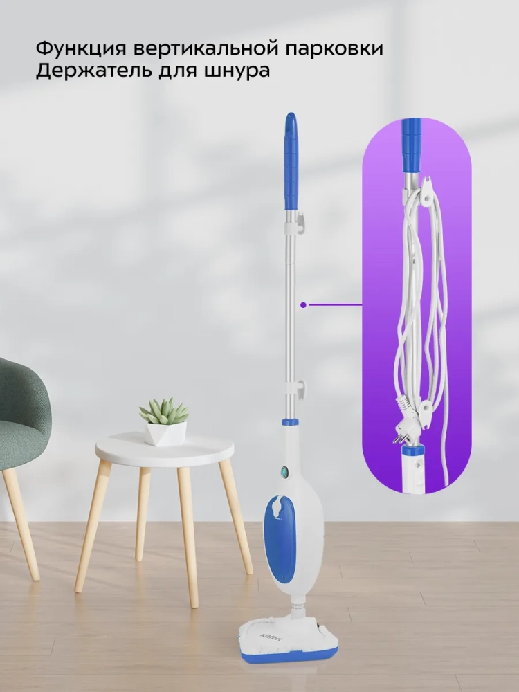 Паровая швабра обладает функцией вертикальной парковки и большим углом наклона при уборке, который поможет легко убирать пространство под мебелью. Напольная щетка закреплена на специальном шаровом шарнире с наклоном в двух плоскостях, что делает швабру очень маневренной и облегчает процесс уборки. На удлинительной трубке предусмотрены держатели для шнура.