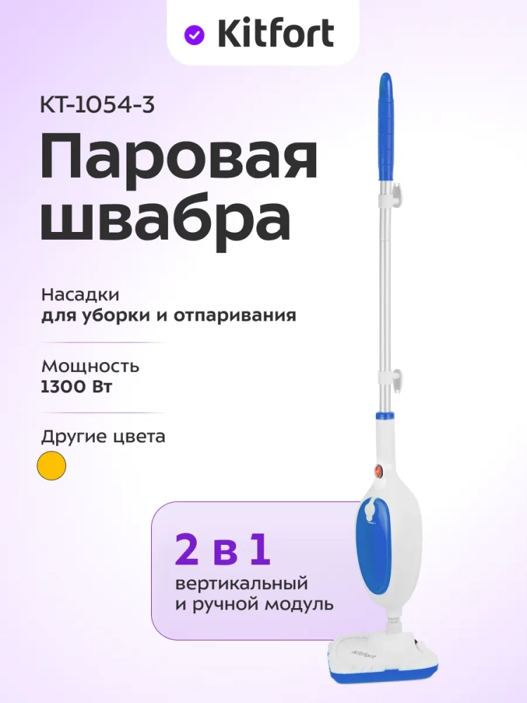 Паровая швабра Kitfort КТ-1054 — универсальное устройство, которое поможет избавиться от пыли и грязи с помощью мощной струи пара, а также продезинфицирует обрабатываемую поверхность. Паровая швабра очистит раковину и плиту на кухне, зеркала и мебель без каких-либо химических средств, исключительно паром.