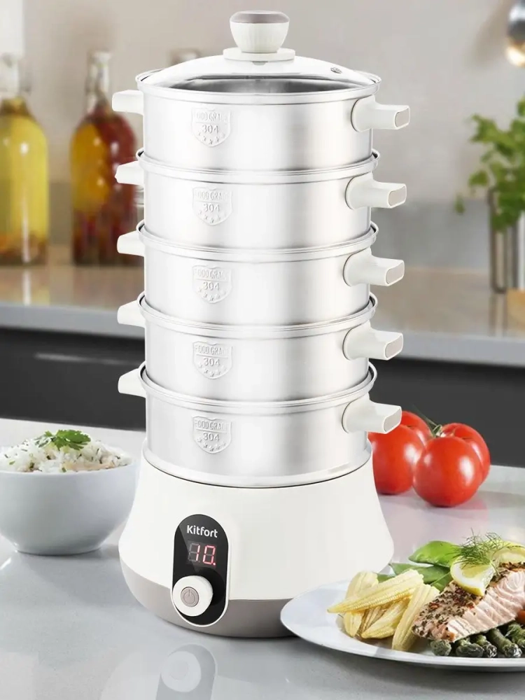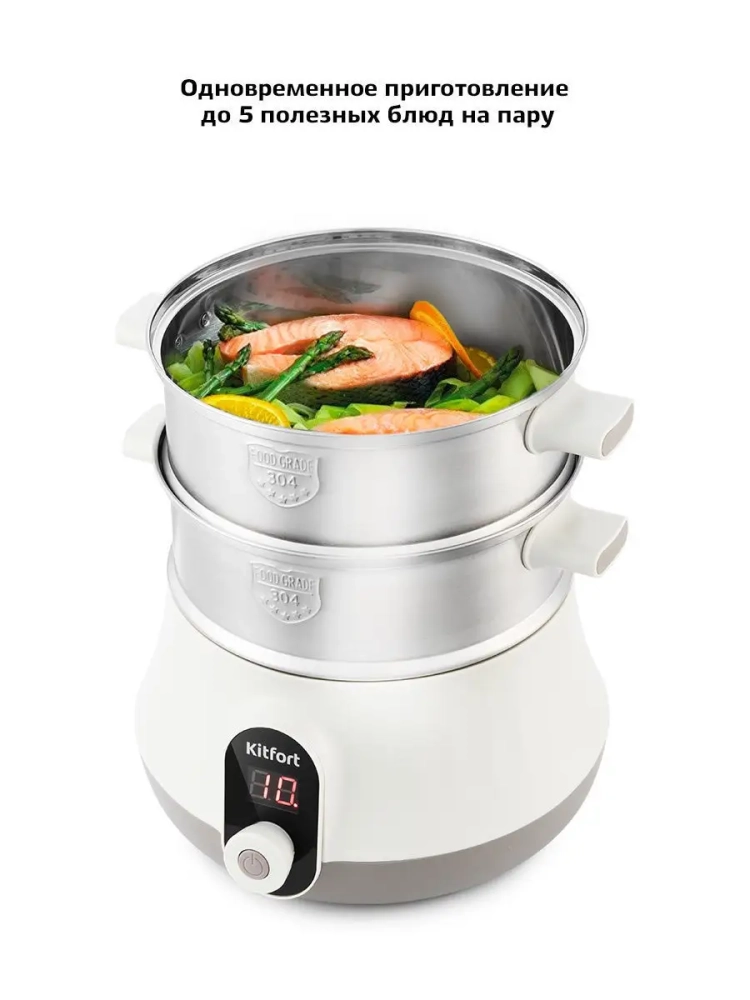 Пароварка Китфорт имеет встроенную защиту от перегрева и защиту от включения без воды. В случае если вы забыли долить воды или вся вода выпарилась, а вы этого не заметили — сработает защита и пароварка отключится.