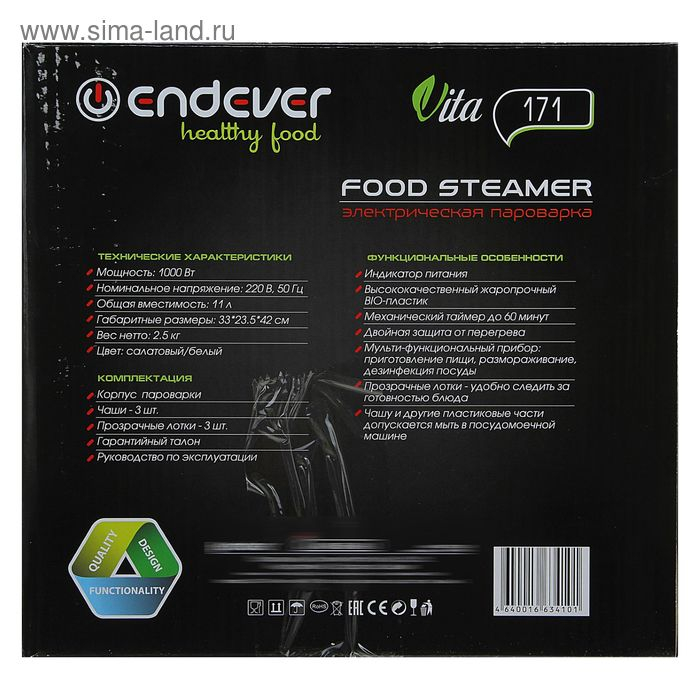Пароварка Endever Vita-171, электрическая, 1000 Вт, 11 л, 3 яруса, бело-зеленая