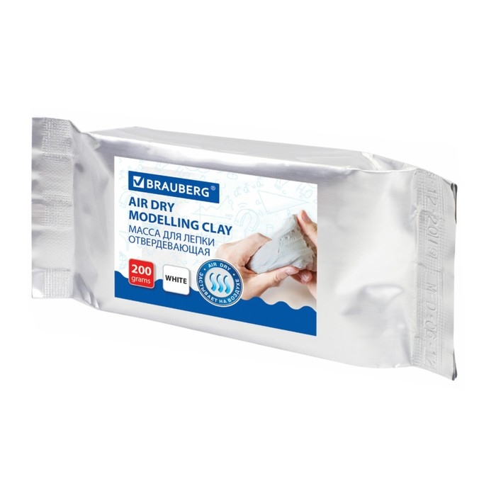 Масса для лепки BRAUBERG белого цвета фасовкой 200 грамм упакована в герметичную фольгированную упаковку, что позволяет хранить товар в течение длительного времени. Масса очень податлива: моделируется руками, пластична, легко лепится, раскатывается, режется, принимает любую форму. При необходимости можно использовать инструменты. Чтобы избежать появление трещин на изделии после застывания, необходимо работать с массой влажными руками. Затвердевает на воздухе, после высыхания становится очень прочной, не усаживается.
