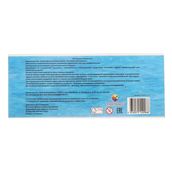 Состав пастели "Петербургский колорит" это натуральные пигменты, природные наполнители, антисептики. Соответствует требованиям таможенного регламента Таможенного союза ТР ТС 007/2011 "О безопасности продукции, предназначенной для детей и подростков".