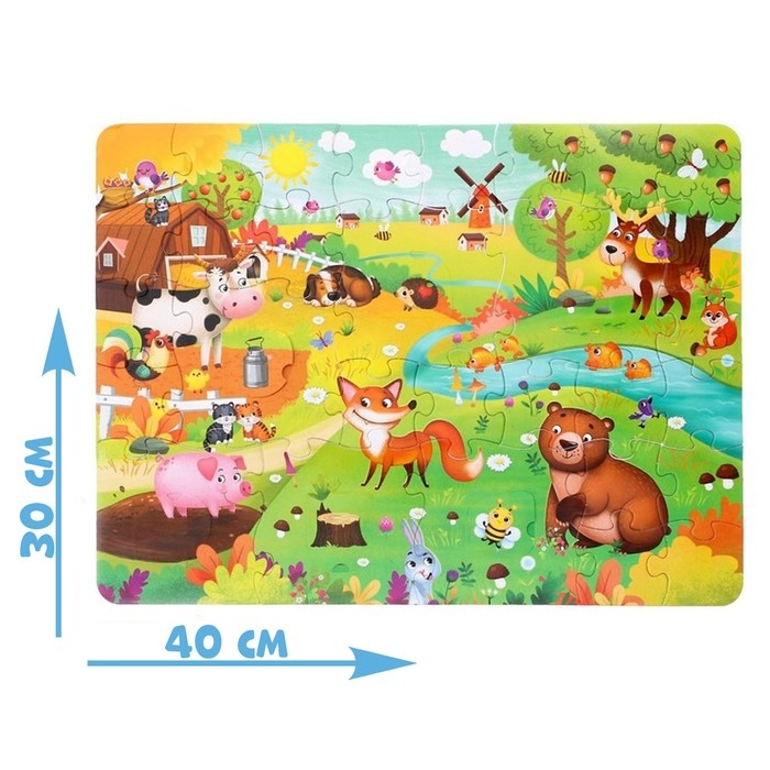 В коробке 30 деталей, детали двух разных размеров. Обычные маленькие и большие детали с окошками внутри. Собрав все детали вы получите картинку размером 40 × 30 см.