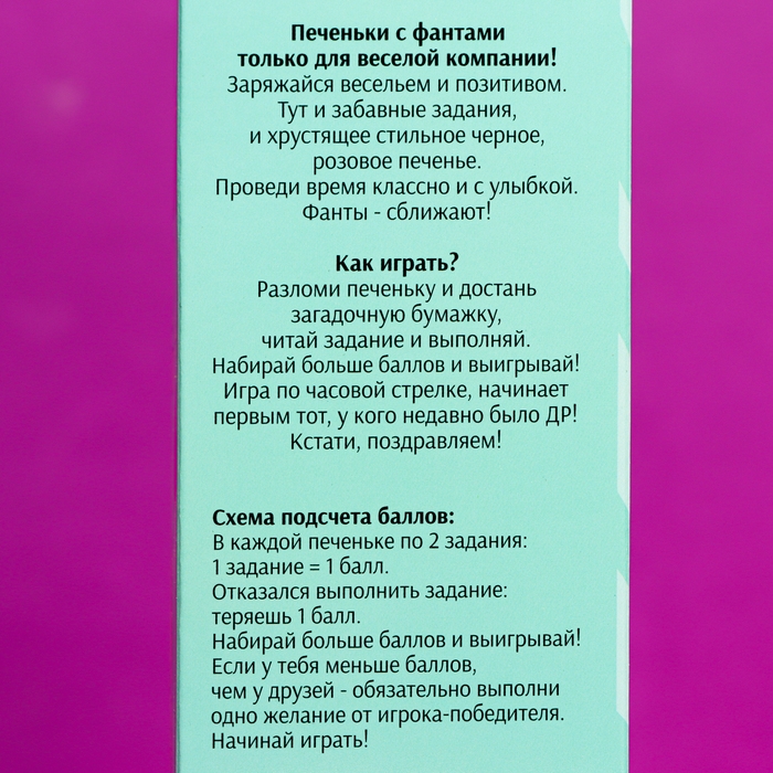 Такое печенье подходит для игры в фанты большой компанией, поэтому Ваши друзья обязательно оценят неординарный подход, а оригинальная надпись-сюрприз оставит после себя массу положительных эмоций!
