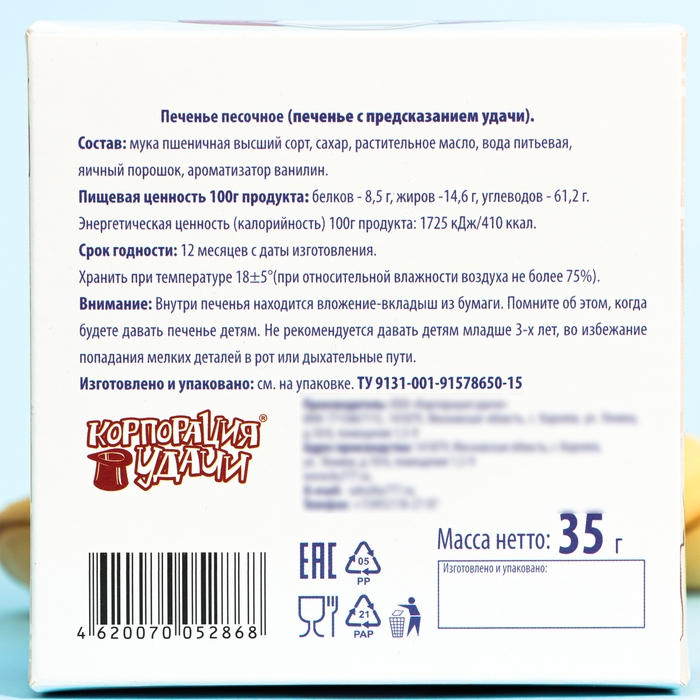 Печенье песочное с предсказаниями "Стандарт", 12 шт., 84 г