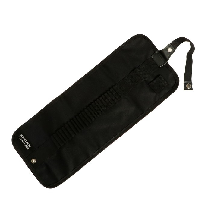 Текстильный футляр-роллер для 24 карандашей. Есть петля для ластика и небольшой карман для точилки. Пенал черного цвета. Петли для цветных карандашей и ластика, а также карман для точилки изготовлены из текстильной резины. После прокатки пенал закрывается кнопкой на текстильной резине.